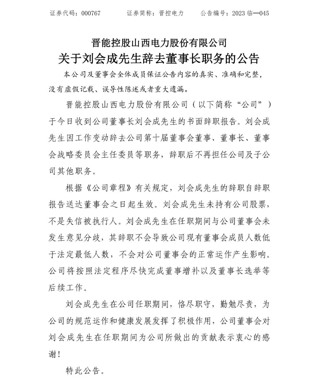 10月11日,晉能控股山西電力股份有限公司發(fā)布公告,劉會(huì)成因工作變動(dòng)辭去公司第十屆董事會(huì)董事、董事長(zhǎng)、董事會(huì)戰(zhàn)略委員會(huì)主任委員等職務(wù),辭職后不再擔(dān)任公司及子公司其他職務(wù)。