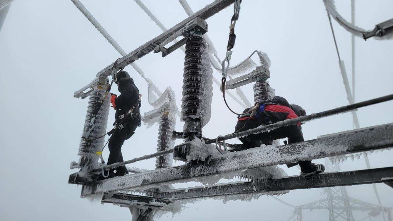 圖為湖南公司黃甲嶺風(fēng)電場運維人員在刀閘上進行除冰操作
