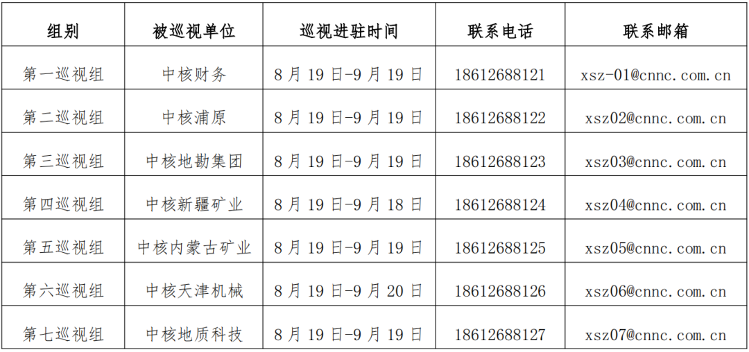 根據(jù)中核集團黨組巡視工作統(tǒng)一部署,8月19日,黨組第一至第七巡視組分別進駐中核財務(wù)有限責(zé)任公司、上海中核浦原有限公司、中核地質(zhì)勘查集團有限公司、中核新疆礦業(yè)有限公司、中核內(nèi)蒙古礦業(yè)有限公司、中核(天津)機械有限公司、中核地質(zhì)科技有限公司等7家單位并召開巡視工作動員會。