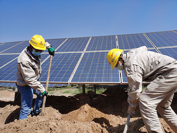 該光伏電站地處內(nèi)蒙古阿拉善烏蘭布和沙漠邊緣,現(xiàn)場土質(zhì)多為粉細(xì)砂,堅土層較薄,不利于光伏站內(nèi)箱式變壓器、逆變器、匯流箱及光伏組串等設(shè) 備基礎(chǔ)穩(wěn)固,特別在雨季時期,雨水對光伏組件基礎(chǔ)沖刷影響較大。該公司運維人員及時開展光伏組件基礎(chǔ)土方回填工作,現(xiàn)場采用機械填土和人工補填方式進(jìn)行,一邊裝載車和挖掘機配合,將土方填至光伏板背光面,另一邊人工回填光伏板正下方區(qū)域。在控制土方高度時,運維人員嚴(yán)格按照規(guī)范要求,夯實并填平土方,保證光伏方陣組件最下端與地面距離不低于0.3米,確保光伏板受光良好。在控制加固工期期間,該公司運維人員早出晚歸、雷厲風(fēng)行,歷時兩天,順利完成任務(wù)區(qū)的基礎(chǔ)加固工作。