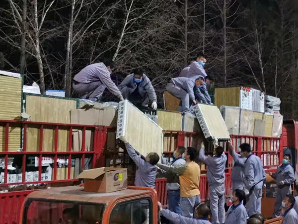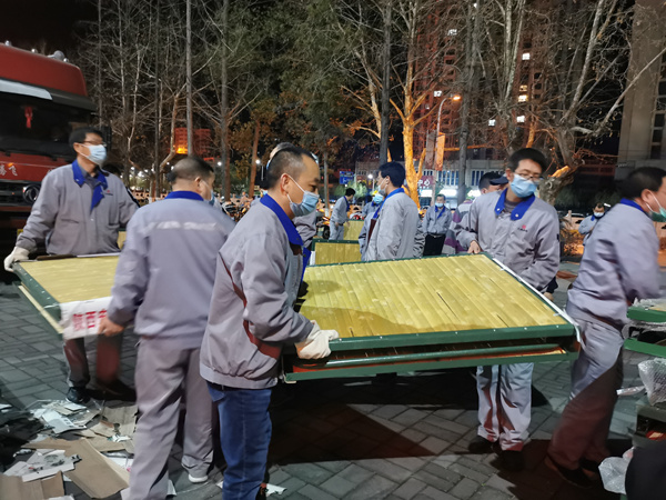 晚上21:40,行軍床運到,中層干部、共產黨員、一線職工不分你我、爭先恐后爬上卡車搬運。“大家戴上手套,注意安全,別傷著自己。”就在此時,一直掛念著駐廠職工們的該公司黨委書記、總經理任寶銅也來到了現場,親切的囑咐大家做好防護、小心搬運。