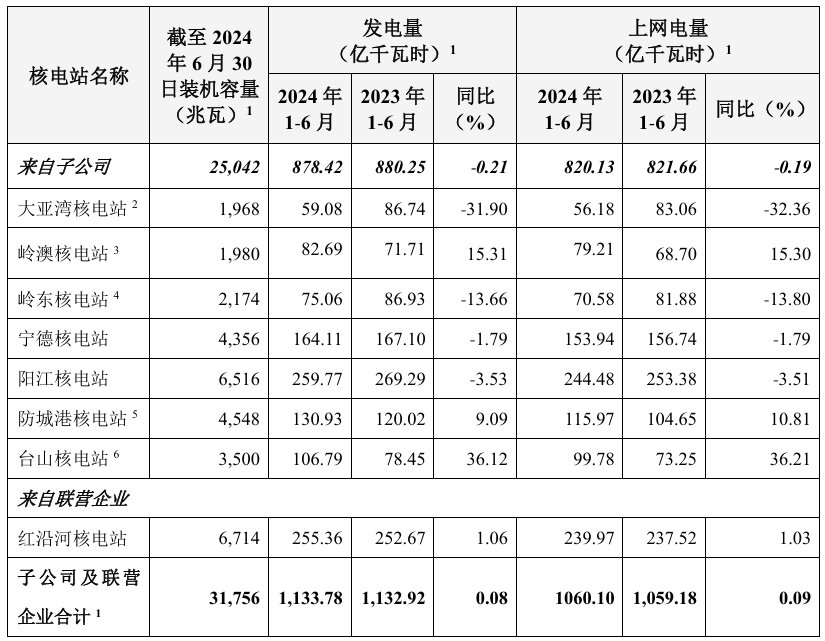 2.大亞灣核電站于2024年1月至6月份新開展了1個換料大修,于2023年同期未開展換料大修。