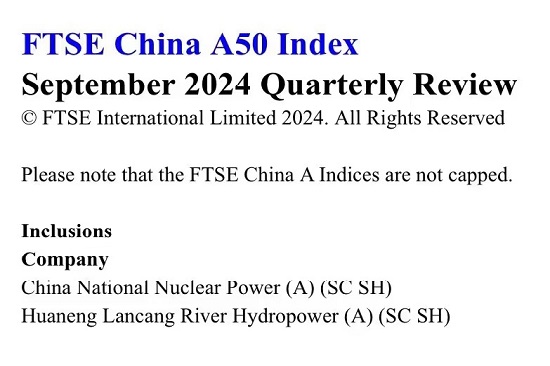 富時(shí)羅素(FTSE Russell)9月4日宣布對富時(shí)中國A50指數(shù)進(jìn)行季度審核變更,納入華能水電等兩只股票,本次變更于9月20日生效。在今年8月,華能水電股票也被納入明晟(MSCI)中國指數(shù)。