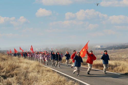 徒步隊(duì)伍精神飽滿、興致高昂、闊步向前,走出廠門后從虎山腳下沿黃營村棗林觀光道向上前行。途經(jīng)之處生態(tài)風(fēng)景獨(dú)特、空氣凌冽清澈,全體人員邁著矯健的步伐、排著整齊的隊(duì)伍、揮舞著鮮艷的國旗,激情迸發(fā)、活力四射,徒步完成近7公里的路程,在碧空湛藍(lán)、冬陽高照的風(fēng)景里,描繪了一幅幅團(tuán)結(jié)一心、眾志成城的拼搏畫面。