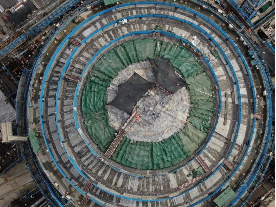 我國自主知識產(chǎn)權(quán)“華龍一號”核電站擁有一個顯著特點——使用大容積雙層安全殼,實現(xiàn)功能分離,內(nèi)殼主要作用是抵御各種事故下及可能的嚴(yán)重事故下內(nèi)部的高溫高壓,外殼主要作用是抵御包括飛機(jī)撞擊在內(nèi)的各種外部災(zāi)害的作用,保護(hù)內(nèi)殼及其內(nèi)部結(jié)構(gòu)不受影響。此次完成封頂?shù)氖莾?nèi)殼穹頂,其半徑31米、壁厚1米、高約10米,需要1785.6立方米的混凝土,采用分層澆筑工藝。