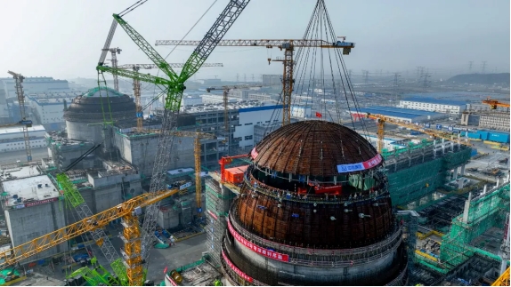 田灣核電8號(hào)機(jī)組穹頂為直徑44米的半球形結(jié)構(gòu),分球帶和球冠兩部分,總重量601.37噸,這是國(guó)內(nèi)最重的薄殼鋼襯里穹頂。江蘇核電堅(jiān)決貫徹全民國(guó)家全教育日“總體國(guó)家安全觀(guān)·創(chuàng)新引領(lǐng)10周年”的主題要求,在現(xiàn)場(chǎng)拼裝中創(chuàng)新采用了自主研發(fā)的激光智能跟蹤焊接技術(shù),填補(bǔ)了國(guó)內(nèi)的空白。充分落實(shí)“安全第一,質(zhì)量第一”的管理方針,確保此次球冠吊到63米高空后,平穩(wěn)控制落在56.869米的球帶上口,并且偏差精度控制在毫米級(jí)別,確保核安全絕無(wú)一失。