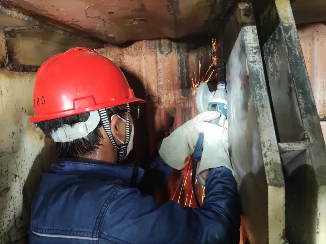 迎峰度夏期間,陜投集團(tuán)趙石畔煤電檢修人員采取各種措施保證設(shè)備健康穩(wěn)定運(yùn)行,加強(qiáng)對(duì)主、輔機(jī)設(shè)備的運(yùn)行調(diào)整、檢修維護(hù),對(duì)重點(diǎn)防汛地段、部位進(jìn)行專項(xiàng)檢查。特別是出現(xiàn)緊急情況下的搶修工作,往往是輪番上陣,人歇工作不停。圖中,點(diǎn)檢郭生磊在鍋爐房消除設(shè)備膨脹受限缺陷,他手持角磨機(jī)一干就是半個(gè)多小時(shí),面對(duì)噪音、高溫、火星飛濺等因素他堅(jiān)持作業(yè)。當(dāng)缺陷消除時(shí),他的衣服早已濕透,但臉上卻露出了笑容。(李磊)