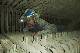 管排余溫散發(fā)熱浪,動一下粉塵便像揚沙一樣落下,眼前一片迷離。借著爐膛內頭燈的照明,能清晰看到在他們睫毛上落定的塵埃......