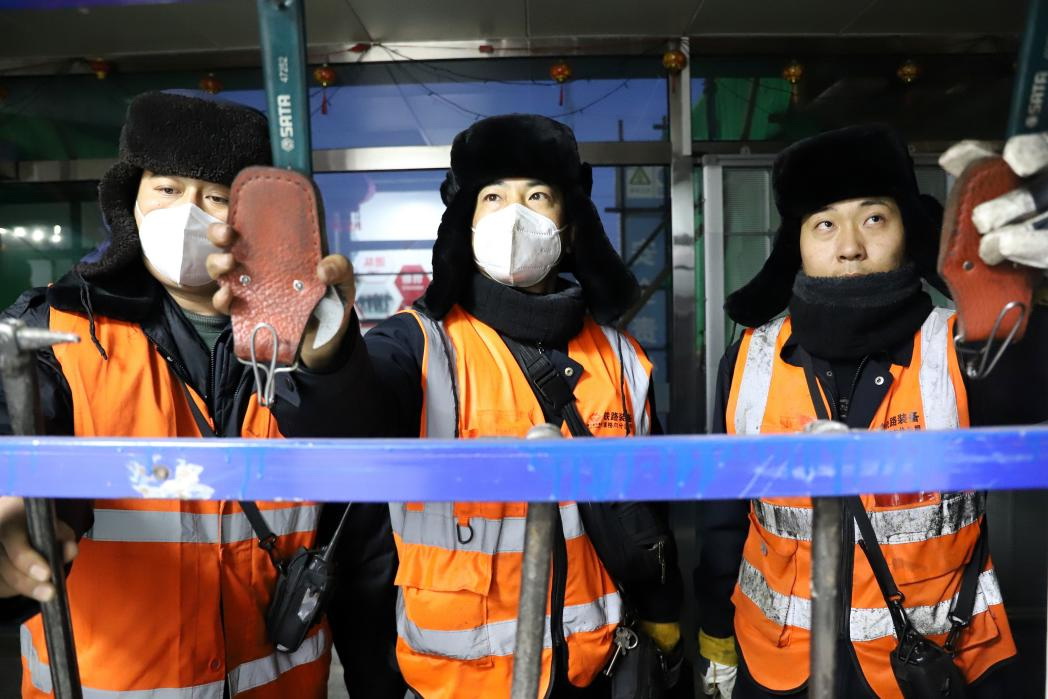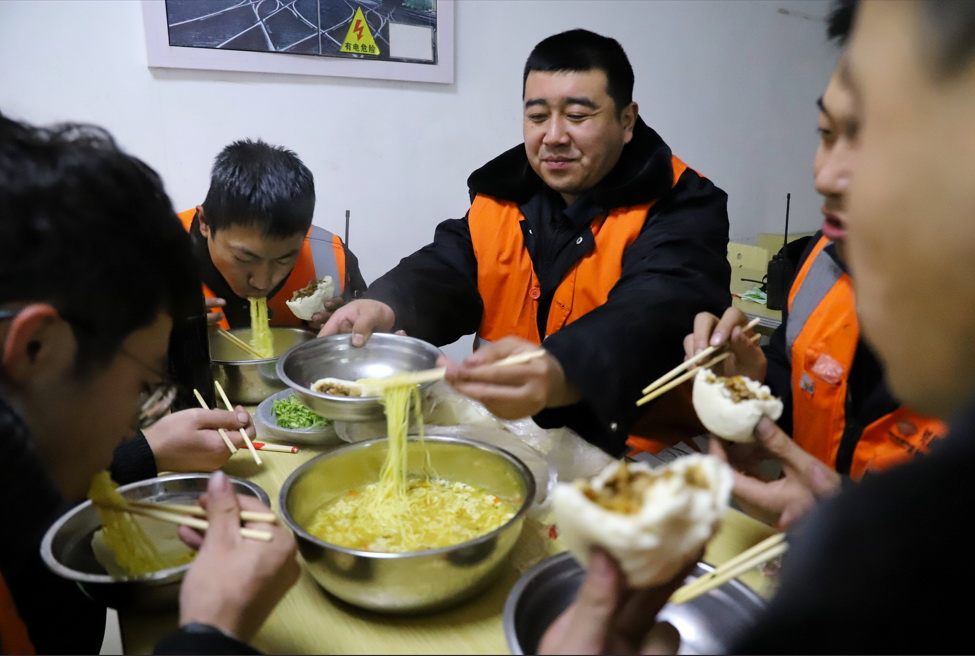 檢車(chē)員們列著整齊的隊(duì)伍滿(mǎn)心歡喜地奔向待檢室,圍坐在臨時(shí)飯桌旁,他們那一雙雙因長(zhǎng)時(shí)間戶(hù)外作業(yè)而黝黑、僵硬的手,與桌上潔白的筷子形成鮮明對(duì)比。餐桌上的面條、饅頭和加熱的菜肴雖簡(jiǎn)單,卻在寒夜中散發(fā)著溫暖。