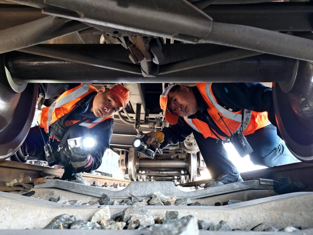 圖為檢車(chē)員正在檢查車(chē)輛底部