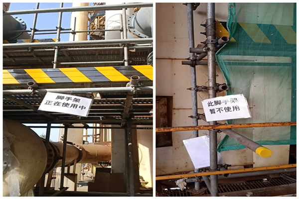 針對檢查發(fā)現(xiàn)的現(xiàn)場腳手架使用狀態(tài)信息無法識別,安全警示不到位的問題,公司領(lǐng)導(dǎo)高度重視,EHS部立即組織各檢修單位召開專題會,明確要求各單位進(jìn)一步完善腳手架搭建驗(yàn)收后的管理要求,對現(xiàn)場所有腳手架進(jìn)行排查梳理,完善“搭建中、驗(yàn)收合格可使用、暫不使用、待拆除”等各種狀態(tài)信息牌,確保高處作業(yè)風(fēng)險可控、在控。