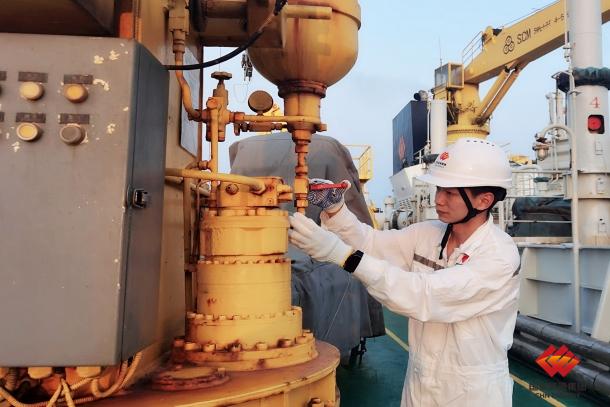 圖為疏浚船舶人員正在進行設(shè)備維護