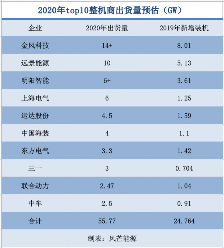 根據(jù)風(fēng)芒能源問詢、統(tǒng)計以及預(yù)估,2020年全年,排名前十的整機商出貨量將超過50GW左右。相較于光伏行業(yè)動態(tài)變化的集中趨勢,風(fēng)電整機商的排名及市占率基本保持穩(wěn)定。其中,TOP3的整機商金風(fēng)科技、遠景能源、明陽智能累計出貨量超過30GW,三家市場占比最終預(yù)計在60%左右,與2019年的62.6%比,雖受搶裝影響,三家市占率稍有減弱,但行業(yè)集中度基本未受影響。