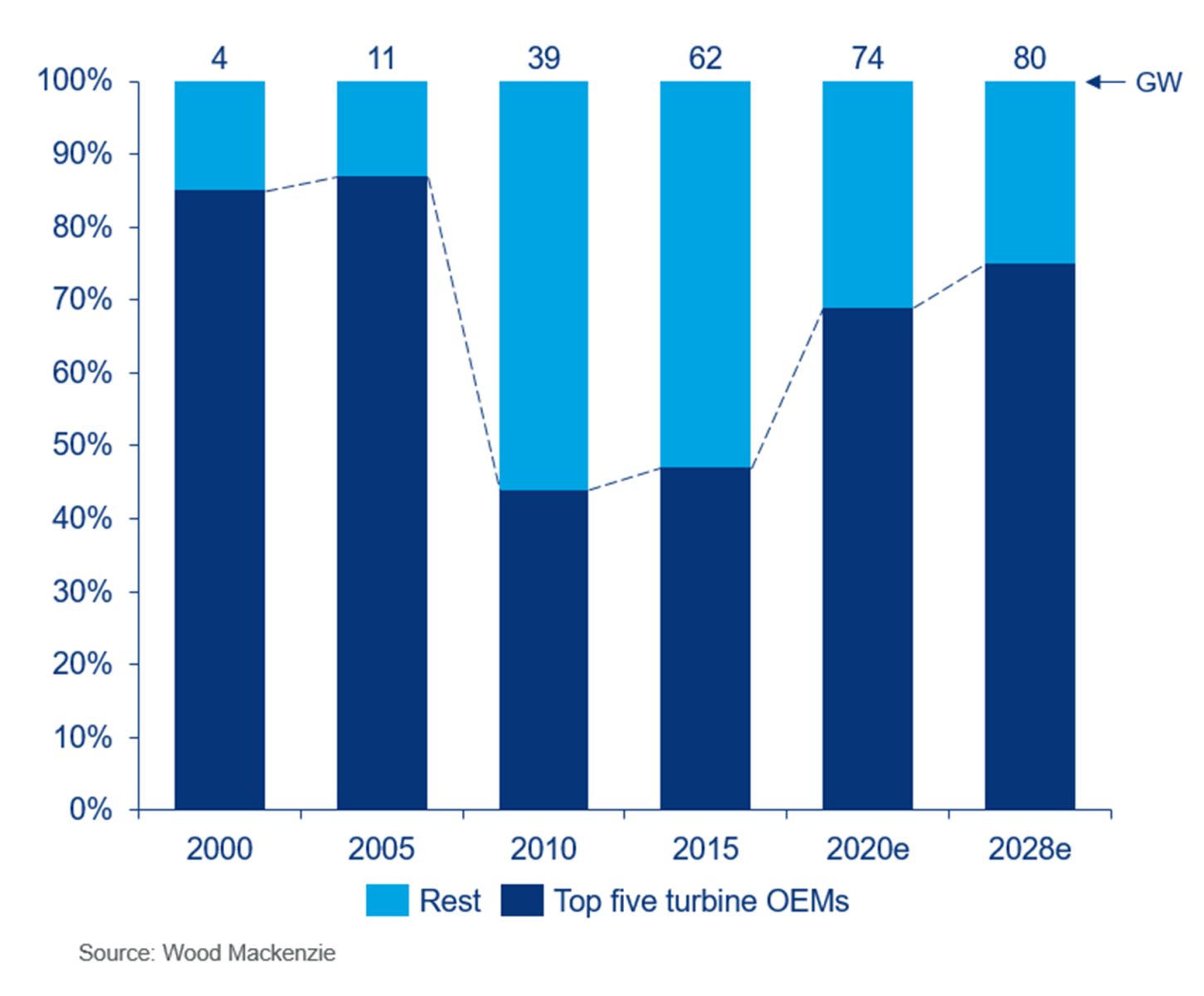 根據(jù)伍德·麥肯齊(Wood Mackenzie)的最新研究,到2028年,領(lǐng)先的三大風(fēng)力渦輪機(jī)原始設(shè)備制造商的市場(chǎng)份額將從2019年的47%(即32GW)增長到60%以上(即48GW)。