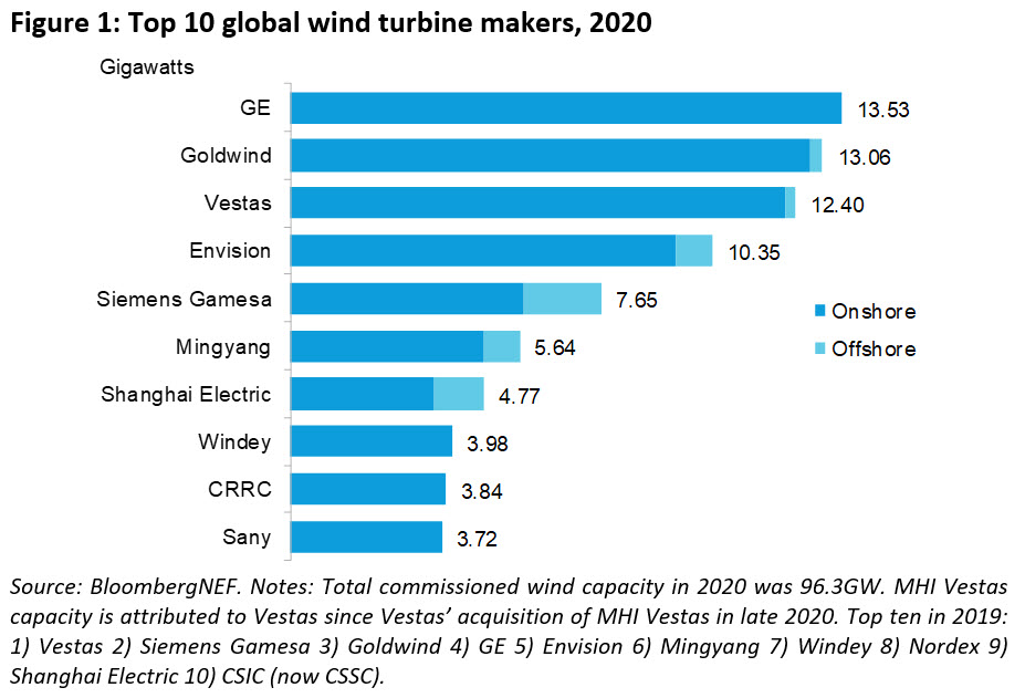 2020年,隨著美國和中國市場的快速增長,通用電氣成為全球最大的風(fēng)機(jī)制造商,占13.53吉瓦,其次是金風(fēng)科技(13.06吉瓦),維斯塔斯(12.4吉瓦),遠(yuǎn)景能源(10.35吉瓦),西門子歌美颯(7.65吉瓦)。