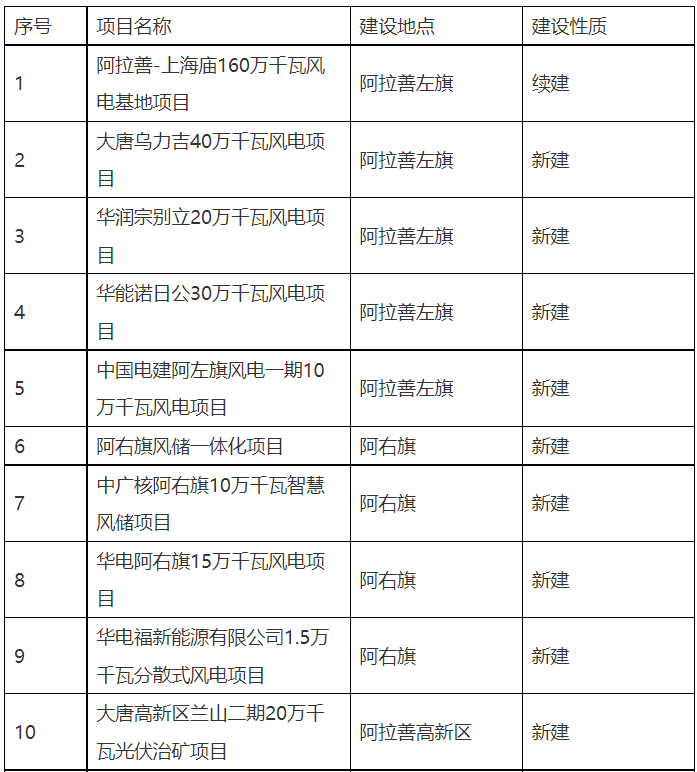 5月24日,內(nèi)蒙古阿拉善盟行政公署發(fā)布2022年重點項目中已審批新能源項目一覽表。