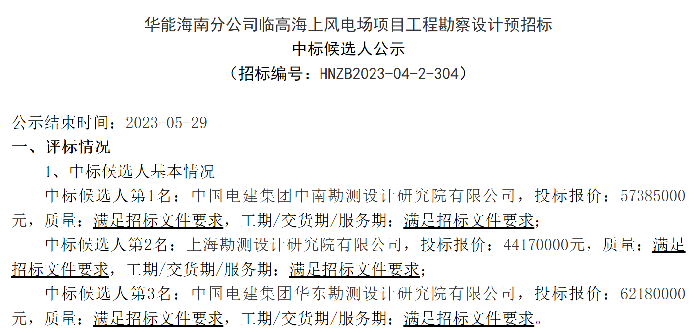 5月25日,華能電子商務(wù)平臺發(fā)布《華能海南分公司臨高海上風(fēng)電場項目工程勘察設(shè)計預(yù)招標(biāo)候選人公示》的公告。