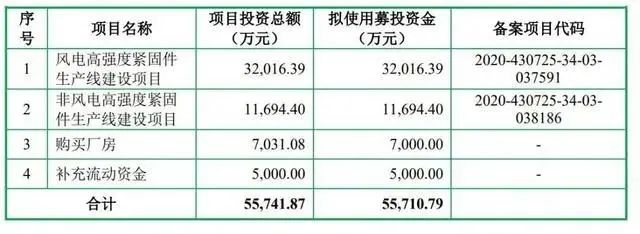 本次IPO,飛沃科技公開發(fā)行A股股票1347萬股,發(fā)行價(jià)格72.5元/股,募集資金總額約為9.77億元,擬用于風(fēng)電高強(qiáng)度緊固件生產(chǎn)線建設(shè)項(xiàng)目、非風(fēng)電高強(qiáng)度緊固件生產(chǎn)線建設(shè)項(xiàng)目、購買廠房、補(bǔ)充流動資金等。