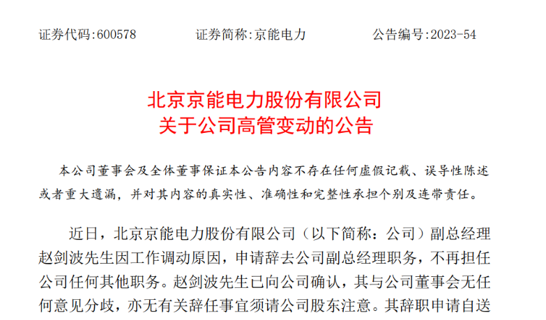 公告披露,近日,京能電力副總經(jīng)理趙劍波先生因工作調(diào)動(dòng)原因,申請(qǐng)辭去公司副總經(jīng)理職務(wù),不再擔(dān)任公司任何其他職務(wù)。趙劍波先生已向公司確認(rèn),其與公司董事會(huì)無(wú)任何意見(jiàn)分歧,亦無(wú)有關(guān)辭任事宜須請(qǐng)公司股東注意。其辭職申請(qǐng)自送達(dá)公司董事會(huì)時(shí)生效。本次人事變動(dòng)不會(huì)影響公司相關(guān)工作的正常開(kāi)展。