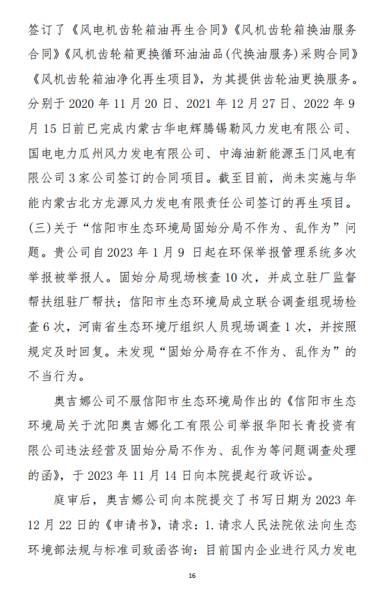 2023年3月9日,奧吉娜公司收到固始分局通過12369環(huán)境信訪平臺的短信答復(fù):“反映問題不屬實”。3月10日,奧吉娜公司向固始分局負責(zé)人電話詢問,其解釋稱:經(jīng)調(diào)查核實,華陽長青公司沒有再生風(fēng)電潤滑油銷售,出售的是新油。否定了奧吉娜公司的舉報內(nèi)容。對此,奧吉娜公司表示強烈不滿。3月11日,奧吉娜公司向環(huán)境部投訴固始分局的不作為和亂作為。2023年5月26日,奧吉娜公司收到12369環(huán)境信訪平臺的短信答復(fù)。答復(fù)部門為信陽環(huán)境局。令人啼笑皆非的是,答復(fù)稱,華陽長青的許可證有效期沒有問題,與舉報內(nèi)容風(fēng)馬牛不相及。2023年6月13日,奧吉娜公司再次向環(huán)境部提出申訴,指出,奧吉娜舉報的不是許可證有效期問題,而是許可證的適用范圍錯誤、違法。2023年7月27日,奧吉娜公司收到回復(fù)稱,經(jīng)信陽市生態(tài)環(huán)境局現(xiàn)場檢查,未發(fā)現(xiàn)固始分局不作為情況。2023年8月3日,奧吉娜公司向河南省生態(tài)環(huán)境廳(以下稱:環(huán)境廳)舉報信陽環(huán)境局包庇固始分局的行為。環(huán)境廳對此高度重視,有關(guān)處長和奧吉娜公司負責(zé)人進行了面談。2023年9月13日,信陽環(huán)境局向奧吉娜公司致《信陽市生態(tài)環(huán)境局關(guān)于沈陽奧吉娜化工有限公司舉報華陽長青投資有限公司違法經(jīng)營及固始分局不作為、亂作為等問題調(diào)查處理的函》。函中:一是,以“齒輪箱”替換“齒輪箱油”,偷換概念;二是,做出了廢風(fēng)電合成(齒輪)油不屬于危險廢物的結(jié)論;三是,未發(fā)現(xiàn)固始分局存在不作為、亂作為的不當(dāng)行為。再次否定奧吉娜公司的舉報和投訴。