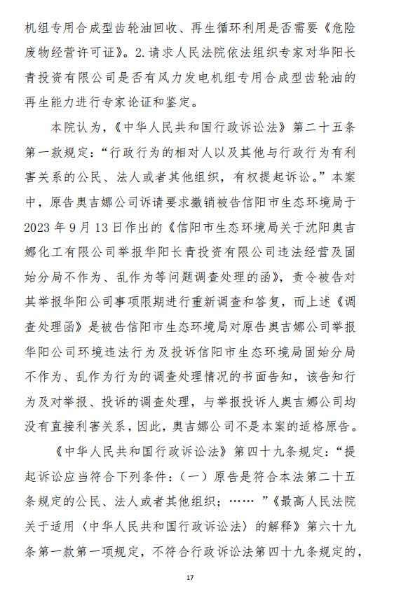 2023年10月18日,奧吉娜公司依據(jù)《行政訴訟法》和《行政訴訟法解釋》,將信陽市環(huán)境局和第三人華陽長青公司訴至信陽市平橋區(qū)人民法院,請求法院:1、判決撤銷被告作出的《信陽市生態(tài)環(huán)境局關(guān)于沈陽奧吉娜化工有限公司舉報華陽長青投資有限公司違法經(jīng)營及固始分局不作為、亂作為等問題調(diào)查處理的函》;2、責(zé)令被告針對原告于2023年8月3日向被告申訴舉報華陽長青投資有限公司事項,限期進行重新調(diào)查和答復(fù);3、請求人民法院判令被告2023年9月13日調(diào)查處理函認定的廢合成油不應(yīng)按危險廢物有關(guān)規(guī)定進行管理,違反法律規(guī)章的規(guī)定,無效。