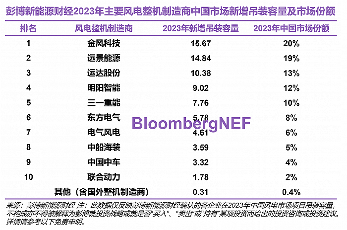 彭博新能源財經(jīng)稱,三一重能2023年的陸上風(fēng)電吊裝容量相較于2022年幾乎翻倍并位列第四,東方電氣實現(xiàn)了陸上風(fēng)電吊裝容量三倍增長,排名第五。