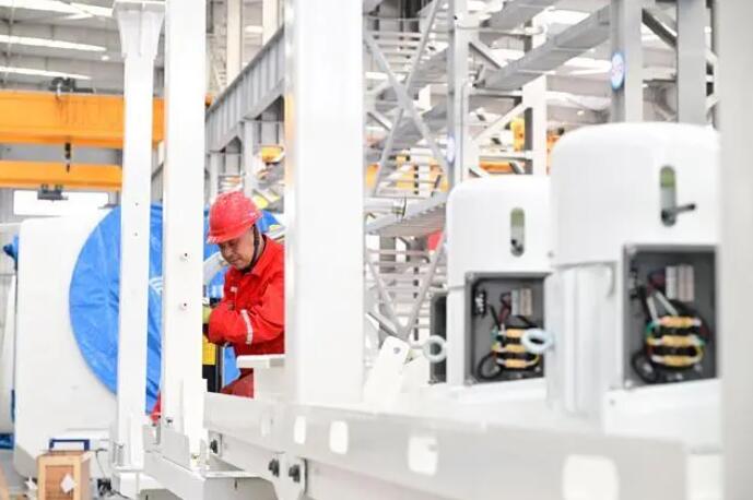 4月10日,工人在隆化縣金風(fēng)電控設(shè)備有限公司風(fēng)電車間裝配機(jī)艙。新華社記者金良快 攝