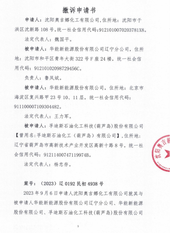 因法定代表人變更,且涉案當事人已受到法律制裁,央企風電招投標招采違法串通申請行政處罰訴訟第一案,沈陽奧吉娜化工有限公司撤訴!
