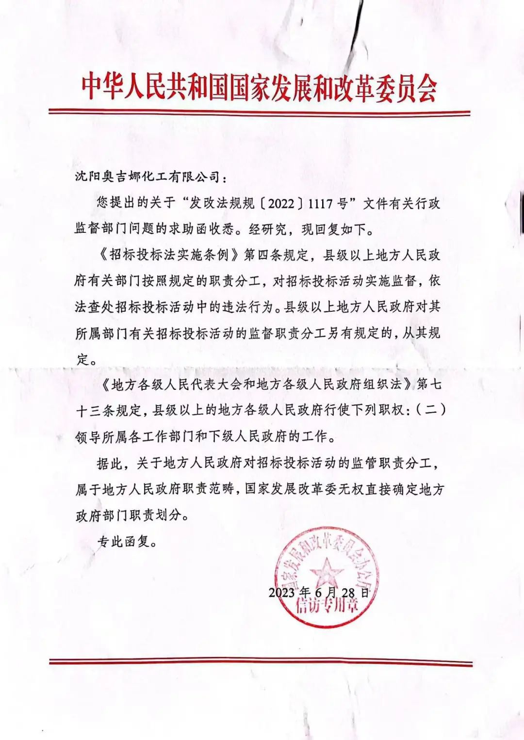 原告曾就被告一和被告三串通投標赤裸裸的違法行為多方尋求監(jiān)督部門監(jiān)管,但一直求告無門,無奈向國家發(fā)展和改革委員會投訴,經(jīng)國家發(fā)展和改革委員會回函“地方人民政府對招標投標活動的監(jiān)管職責分工,屬于地方人民政府職責范疇,國家發(fā)展改革委無權直接確定地方政府部門職責劃分”(下附國家發(fā)改委回函)。