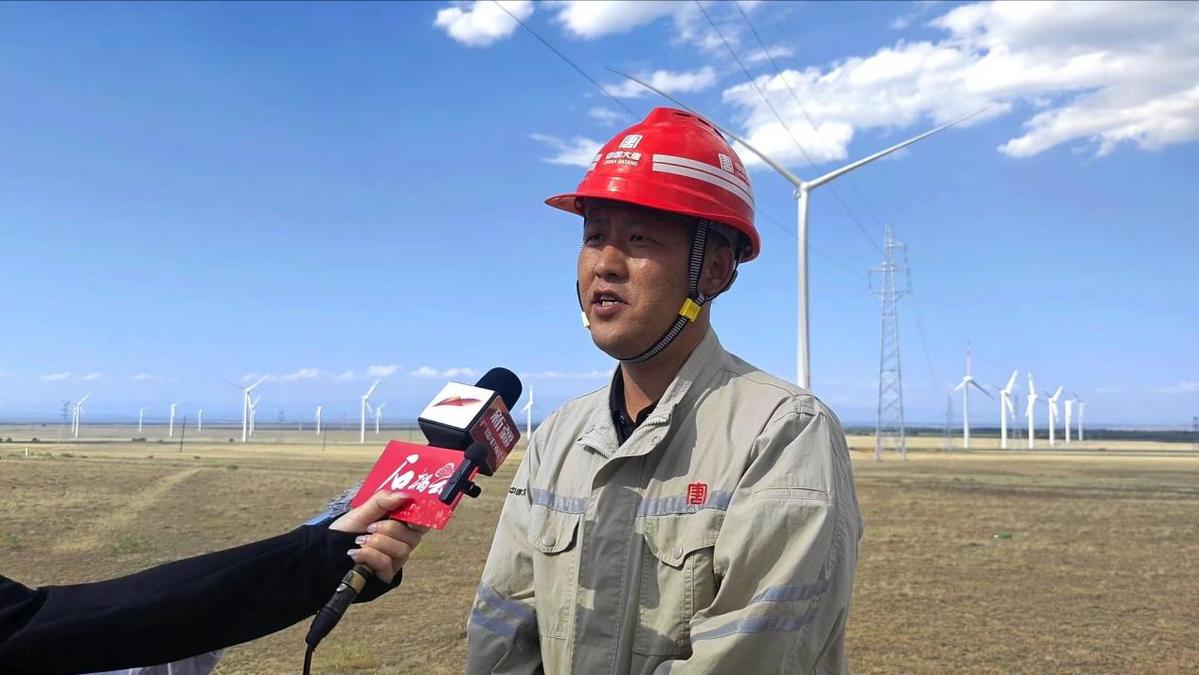 圖:大唐托里縣清潔能源有限公司老風(fēng)口風(fēng)電項(xiàng)目副經(jīng)理祁景華介紹風(fēng)力發(fā)電項(xiàng)目進(jìn)展