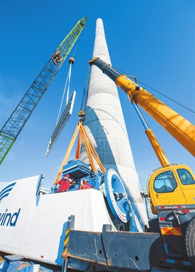 12月18日,在位于新安縣鐵門鎮(zhèn)的雷華風(fēng)電場項目內(nèi),大型機械正在進行風(fēng)機塔筒吊裝作業(yè)。