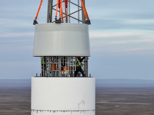 該首臺套風電機組并網(wǎng),標志著全球規(guī)模化商用最大混塔風力發(fā)電機組在內(nèi)蒙古能源集團成功發(fā)電運行。項目使用的風電設(shè)備單機容量10兆瓦,混塔高134.4米,整機高度140米,葉片長112米,風輪直徑230米,覆蓋及掃風面積更大,經(jīng)濟性和發(fā)電量相對更高。值得一提的是,此項目風機塔筒由鋼筋混凝土中空、重力式基礎(chǔ)+上部高強混凝土預(yù)制管片疊合而成,是國內(nèi)首次采用內(nèi)張拉、預(yù)應(yīng)力技術(shù)的10兆瓦混塔風力發(fā)電項目。塔筒內(nèi)部預(yù)留孔洞固定鋼纜,鋼纜固定后進行水泥灌漿填充縫隙,風機運行中旋轉(zhuǎn)產(chǎn)生擺動,使用此技術(shù),在擺動時,塔筒內(nèi)部結(jié)構(gòu)均勻受力,整體擺幅程度大大降低,使塔筒整體性更好、耐久性更強、預(yù)應(yīng)力損失小,混塔結(jié)構(gòu)塔筒優(yōu)勢突出。