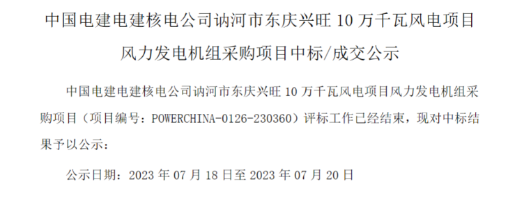 7月18日,中國電建集中采購平臺發(fā)布《中國電建電建核電公司訥河市東慶興旺10萬千瓦風(fēng)電項目風(fēng)力發(fā)電機組采購項目中標/成交公示》的公告。