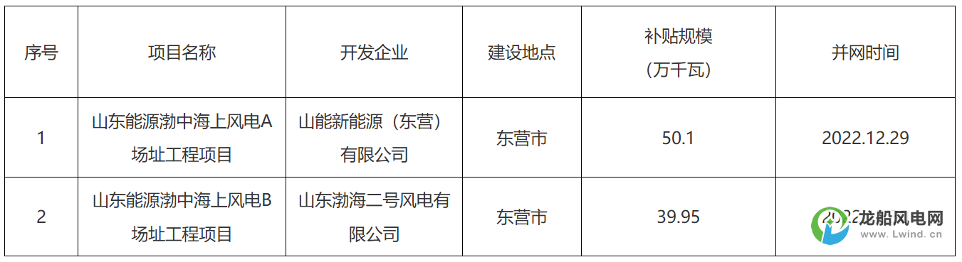 公告顯示,山東省能源局結(jié)合《山東省海上風(fēng)電財(cái)政補(bǔ)貼實(shí)施細(xì)則》有關(guān)規(guī)定,組織專家組對東營市上報(bào)的2022年度建成并網(wǎng)海上風(fēng)電項(xiàng)目財(cái)政補(bǔ)貼申請材料進(jìn)行了復(fù)審。經(jīng)復(fù)審,東營市上報(bào)的兩個海上風(fēng)電項(xiàng)目補(bǔ)貼申請材料符合要求,項(xiàng)目基本信息及補(bǔ)貼規(guī)模公示如下:
