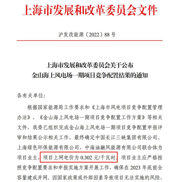 今年4月,上海市發(fā)改委公布了金山海上風(fēng)電場一期項目競爭配置結(jié)果,最終確定中國長江三峽集團(tuán)有限公司、上海綠色環(huán)保能源有限公司、中海油融風(fēng)能源有限公司聯(lián)合體為項目業(yè)主,項目上網(wǎng)電價為0.302元/千瓦時。