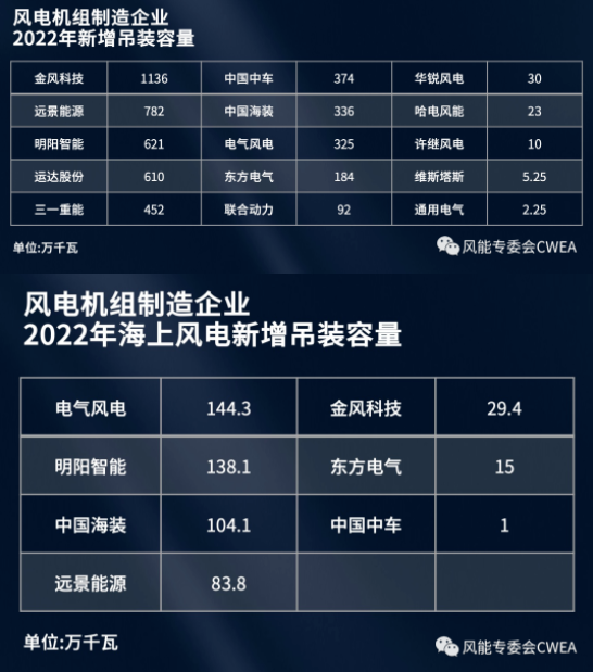 2022年,中國(guó)新增吊裝容量前五的風(fēng)電機(jī)組制造企業(yè)是金風(fēng)科技、遠(yuǎn)景能源、明陽(yáng)智能、運(yùn)達(dá)股份、三一重能,其新增裝機(jī)容量分別為1136萬(wàn)千瓦、782萬(wàn)千瓦、621萬(wàn)千瓦、610萬(wàn)千瓦、452萬(wàn)千瓦。