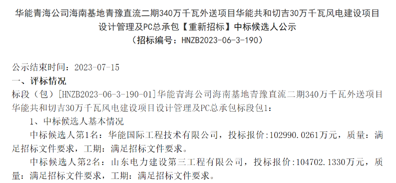 公告顯示,第一中標(biāo)候選人:華能國際工程技術(shù)有限公司,投標(biāo)報價:102990.0261萬元。第二中標(biāo)候選人:山東電力建設(shè)第三工程有限公司,投標(biāo)報價:104702.1330萬元。第三中標(biāo)候選人:中國電建集團山東電力建設(shè)第一工程有限公司,投標(biāo)報價:109934.0179萬元。