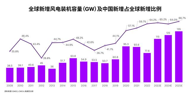 未來(lái)三年,全球新增風(fēng)電裝機(jī)容量將保持15%以上的復(fù)合增長(zhǎng)率,突破375GW,中國(guó)風(fēng)電新增裝機(jī)容量占全球比重預(yù)計(jì)將保持在50%以上,持續(xù)引領(lǐng)全球風(fēng)電增長(zhǎng)。