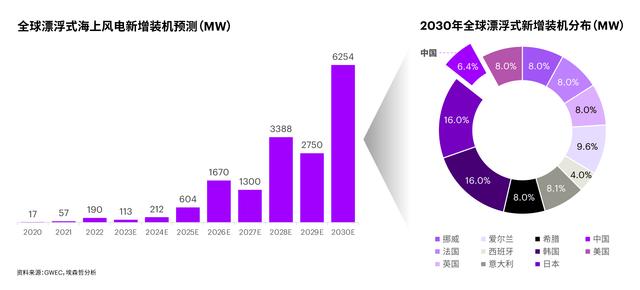 海上風(fēng)電向深遠(yuǎn)海域進(jìn)發(fā):漂浮式風(fēng)電為加速進(jìn)軍深遠(yuǎn)海域開辟了新前景。全球已有202.55MW的漂浮式風(fēng)電項(xiàng)目投運(yùn),2023-2025年將有530MW漂浮式風(fēng)電項(xiàng)目投運(yùn)4。根據(jù)GWEC的預(yù)測(cè),2026年將實(shí)現(xiàn)漂浮式風(fēng)電的商業(yè)化。預(yù)計(jì)到2030年,漂浮式風(fēng)電裝機(jī)規(guī)模將顯著增長(zhǎng),其中中國(guó)新增裝機(jī)容量將達(dá)400MW,占全球新增的6.4%。