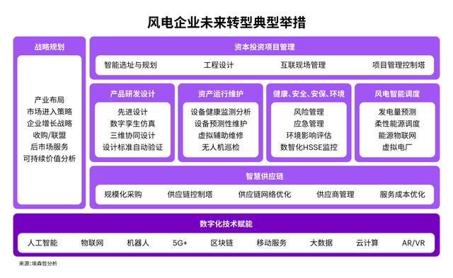埃森哲認(rèn)為,風(fēng)電企業(yè)可從“戰(zhàn)略規(guī)劃、資本投資項(xiàng)目管理、產(chǎn)品研發(fā)設(shè)計(jì)、資產(chǎn)運(yùn)行維護(hù)、HSSE(健康、安全、安保、環(huán)境)、風(fēng)電智能調(diào)度、智慧供應(yīng)鏈、數(shù)字化技術(shù)賦能”八個(gè)方面布局進(jìn)階之路,行穩(wěn)致遠(yuǎn)。