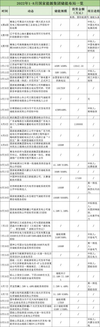 據(jù)不完全統(tǒng)計(jì),2022年1-8月,國家電投與寧德時(shí)代、中國電建、中國天楹等簽訂合作協(xié)議,圍繞儲能材料、風(fēng)光氫儲、重力儲能等方面進(jìn)行合作。儲能項(xiàng)目招標(biāo)26個(gè),涉及飛輪儲能、液流電池、鉛炭電池、抽水蓄能及智慧新能源等方面。