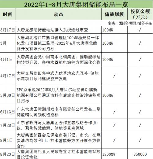 據(jù)不完全統(tǒng)計(jì),2022年1-8月,大唐集團(tuán)儲能項(xiàng)目招標(biāo)3個(gè),與山東、保定、南水北調(diào)集團(tuán)等簽訂合作協(xié)議,涉及抽水蓄能、智慧能源等領(lǐng)域。