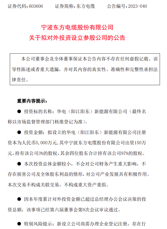 12月2日,東方電纜發(fā)布關(guān)于擬對(duì)外投資設(shè)立參股公司的公告。根據(jù)公告顯示,華電新能源集團(tuán)股份有限公司、廣東金風(fēng)科技有限公司、寧波東方電纜股份有限公司、中國(guó)水利水電第四工程局有限公司、海南程邦投資控股有限公司 五方共同出資在廣東省陽(yáng)江市成立合資公司負(fù)責(zé)廣東華電陽(yáng)江三山島六50萬(wàn)千瓦海上風(fēng)電項(xiàng)目投資、建設(shè)、 運(yùn)營(yíng)。
