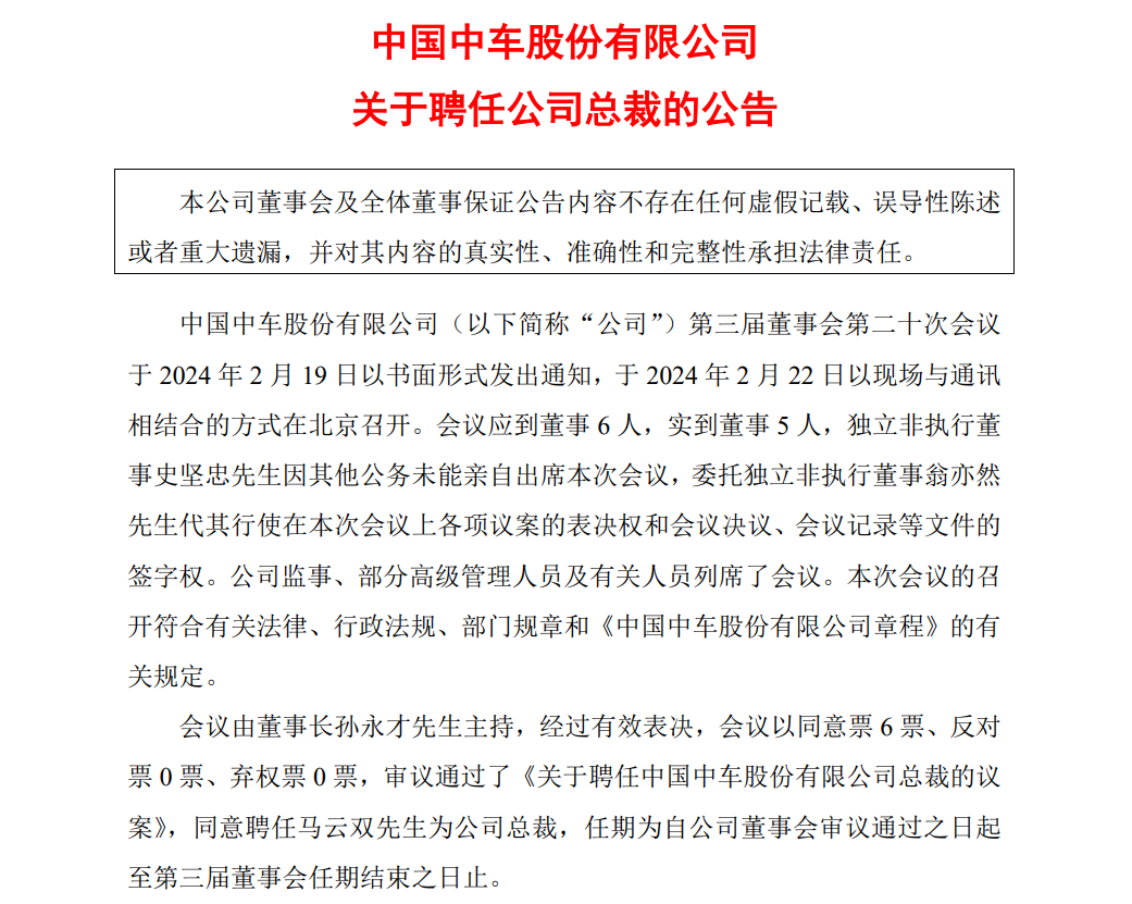 公告披露,中國中車召開第三屆董事會第二十次會議,審議通過了《關(guān)于聘任中國中車股份有限公司總裁的議案》,同意聘任馬云雙先生為公司總裁,任期為自公司董事會審議通過之日起至第三屆董事會任期結(jié)束之日止。