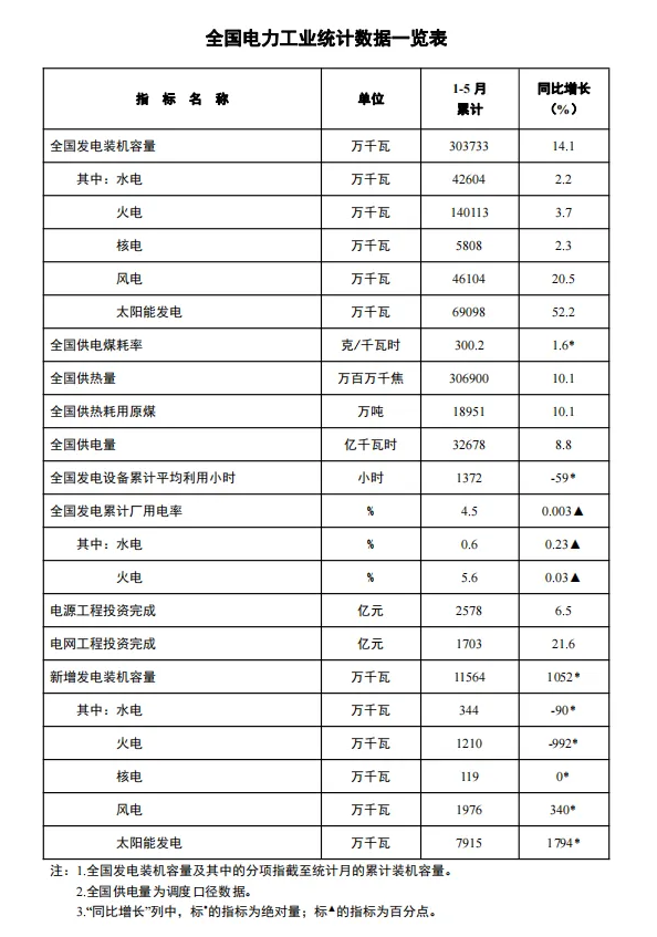 截至5月底,全國累計發(fā)電裝機容量約30.4億千瓦,同比增長14.1%。其中,太陽能發(fā)電裝機容量約6.9億千瓦,同比增長52.2%;風電裝機容量約4.6億千瓦,同比增長20.5%。