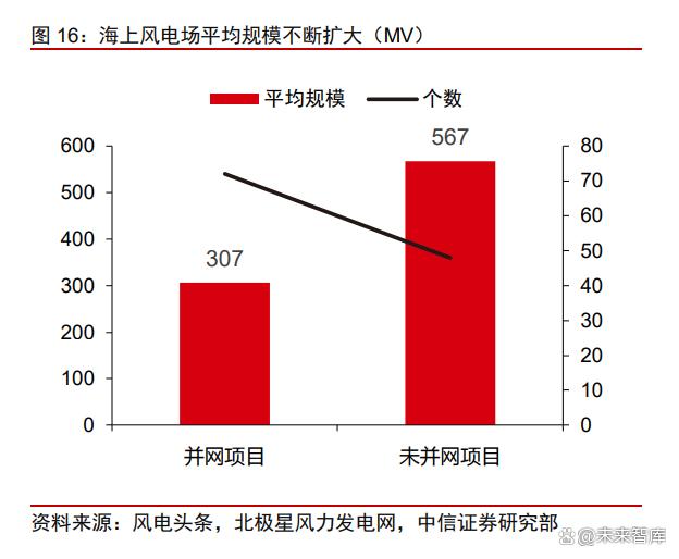 大型化和風電場規(guī)?;铀伲苿语L機降本。大型化是海風降低單位 GW 成本的主要 途徑,大型風機單位功率對應的耗材更少,同時由于大型化后所需機組數(shù)量有效減少,可 顯著降低安裝及運維成本。根據(jù)明陽智能官網(wǎng)披露,以明陽智能 MySE12MW 半直驅海上 機組為例,在 1000MW 項目中,8MW 機組需要 125 臺,12MW 機組僅需 84 臺,節(jié)約用 海面積 30%以上,全場基礎成本降低 24%,塔筒成本降低 27%,經(jīng)濟性凸顯。