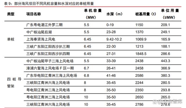 風電大型化和深海化推動樁基、塔筒單機用量增長。據(jù)海力風電招股書,適用于 0- 24m 水深單機容量 4MW 的單樁基礎重量在每臺 550-1000 噸之間;水深 30m 以上單機 容量 5MW 使用的四樁導管架基礎重量為 243 噸。以三峽陽江沙扒三期和三峽陽江青洲六 項目對比測算樁基塔筒單機用量,陽江沙扒三期安裝單機容量 6.45MW 風機 62 臺,陽江 青洲六分別安裝 8MW 和 10MW 容量風機 25 和 80 臺,風機葉片直徑、輪轂高度數(shù)值均增 大,單臺塔筒和樁基用量為 734 噸和 2657 噸,較淺水域小容量風機項目對應的 380 噸和 1693 噸用量提升。