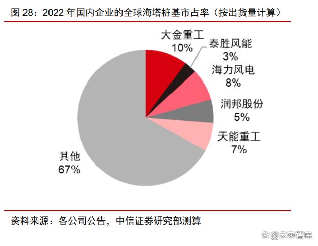 海風(fēng)基礎(chǔ)高壁壘高門檻,國內(nèi)行業(yè)格局集中。與陸上塔筒的分散格局不同,由于海上 塔筒樁基所需碼頭資源的緊缺和產(chǎn)能布局的重要性,國內(nèi)目前從事海風(fēng)塔筒和樁基生產(chǎn)的 企業(yè)較少,大金重工、海力風(fēng)電、天順風(fēng)能、潤邦股份和泰勝風(fēng)能為主的少數(shù)領(lǐng)先企業(yè)貢 獻國內(nèi)的主要行業(yè)產(chǎn)能。我們根據(jù)出貨量測算,2022 年主導(dǎo)企業(yè)海力風(fēng)電、大金重工、 泰勝風(fēng)能、天能重工、潤邦股份的海上塔筒和樁基的全球市占率合計約 30%。