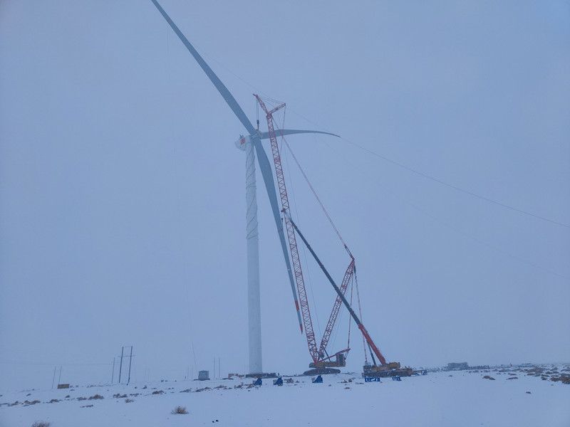 11月27日,在最后一臺風(fēng)機(jī)的吊裝現(xiàn)場,面對施工環(huán)境的變化和溫度驟降,現(xiàn)場的吊裝工作人員顯得格外謹(jǐn)慎,伴隨著對講機(jī)中不斷傳來的指令,主吊司機(jī)小心翼翼撥動著操縱桿,司索工有的放矢牽引著纜風(fēng)繩,安裝工井然有序,所有人不懼嚴(yán)寒堅(jiān)守在各自崗位上,將巨大的風(fēng)機(jī)葉輪緩緩吊起;到達(dá)指定高度后,原本平行的葉輪逐漸轉(zhuǎn)為垂直并緩慢地向主機(jī)艙靠近;經(jīng)過多次精準(zhǔn)的調(diào)整,風(fēng)機(jī)葉輪終于與主機(jī)實(shí)現(xiàn)完美對接……吊裝團(tuán)隊(duì)在經(jīng)歷了50多個(gè)小時(shí)的緊張作業(yè)后,風(fēng)機(jī)像一位全副武裝的鋼鐵巨人張開臂膀屹立在天地之間,在隨風(fēng)飄蕩的雪花和不遠(yuǎn)處其他小型風(fēng)機(jī)的襯托下,更顯現(xiàn)出它的挺拔宏偉。