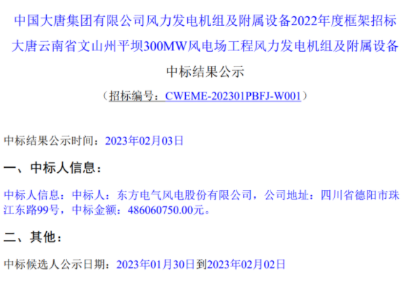 公告顯示,東方電氣風(fēng)電股份有限公司成功中標(biāo)該項(xiàng)目,中標(biāo)價(jià)格為486060750.00元。